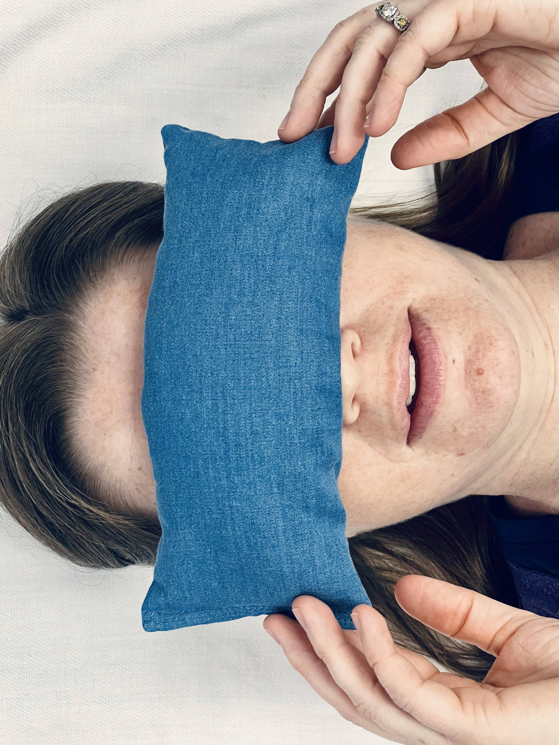 Filled with lavender and chamomile. Weighted with flaxseed to provide gentle stimulation to nerves and relieve sinus pressure. Great item for relaxation and self-care. Comes in a variety of satin and denim options!